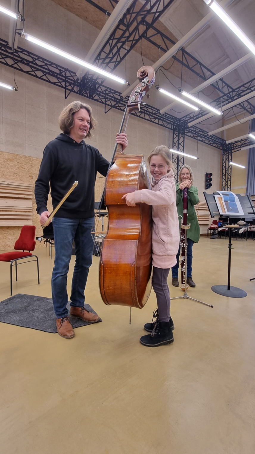 Danach konnten beide Instrumente hautnah erlebt werden: einmal den Kontrabass anheben, mit dem Bogen über die Saiten streichen und in ein Doppelrohrblatt wie beim Fagott blasen.
